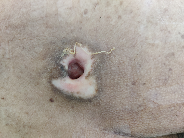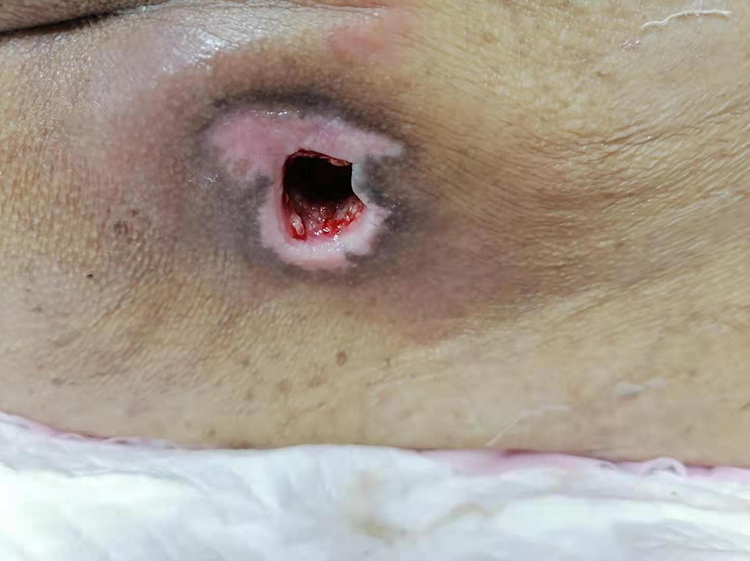 患者2:男,80岁,血糖高,右足外踝部一深度6mm深,铜钱大创面两月余